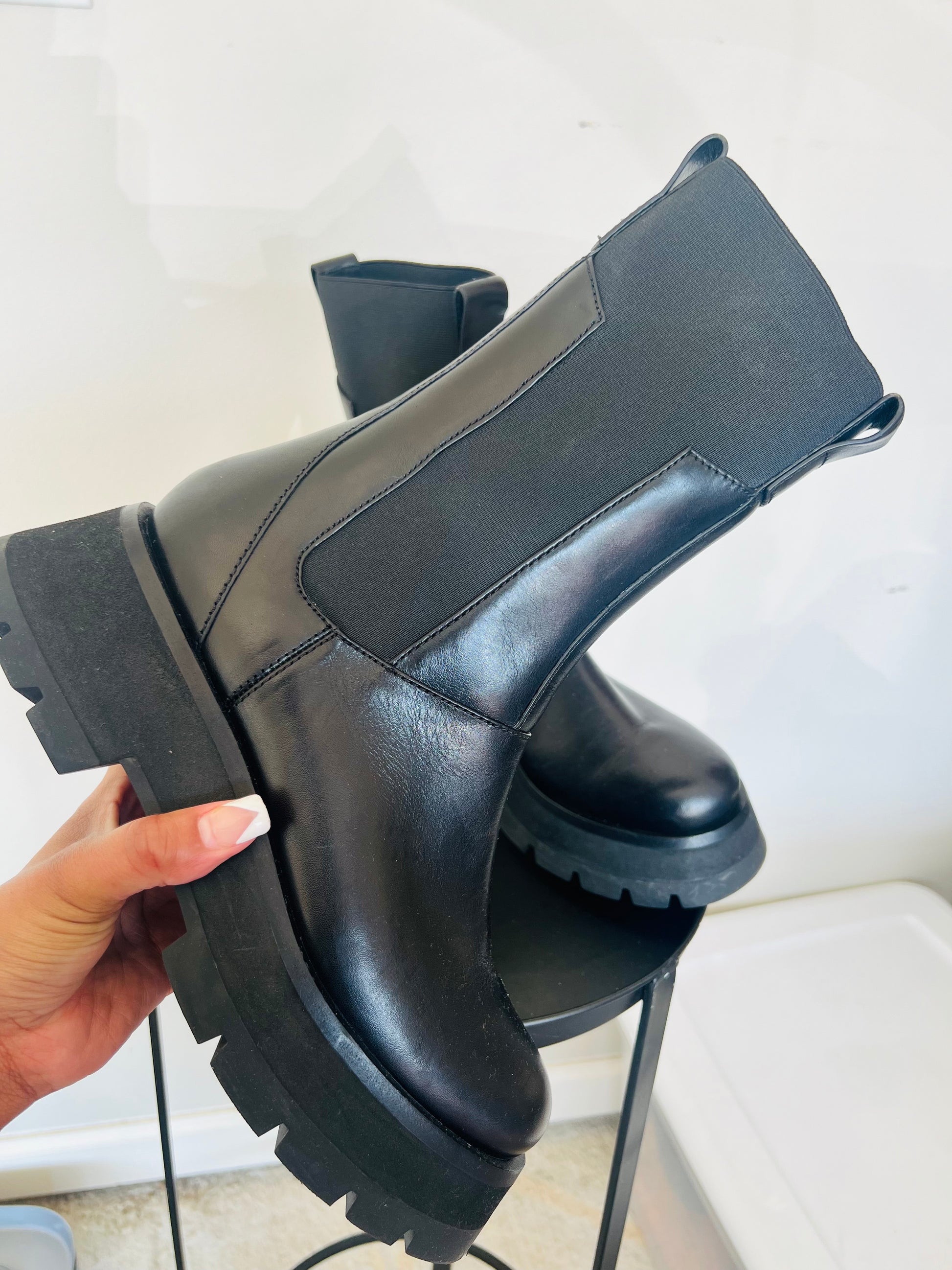 COMBAT BOOT W/ELASTIC SIDE PANALS PULLS AT FRONT AND BACK ROUND TOE CHUNKY LUG SOLE BLOCK ANGULAR HEEL